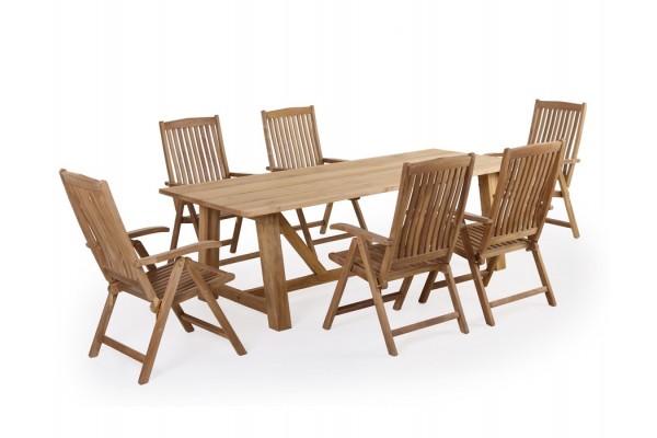 Superflot Hercules plankebord sammen med 6 Devon positionsstole. Alt i solid og ekstra kraftig kvalitet i lækkert kerne teaktræ.
