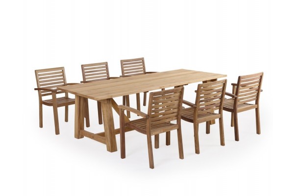 Superflot Hercules plankebord sammen med 6 Pala stabelstole. Alt i solid og ekstra kraftig kvalitet i lækkert kerne teaktræ.