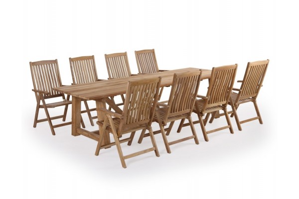 Sættet består af 8 stk. Devon positionsstole og Hercules plankebord str. 100×290 cm.