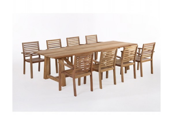 Sættet består af 8 stk. Pala stabelstole og Hercules plankebord str. 100×290 cm.