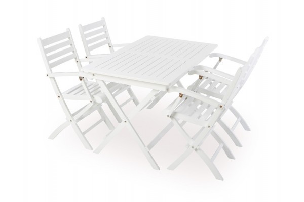 Flot sæt der består af 4 stk. foldestole med armlæn samt foldebord på 70 x 130 cm. Passer godt til altanen – da bord og stole kan klappes sammen. I hvidmalet mahogni-træ