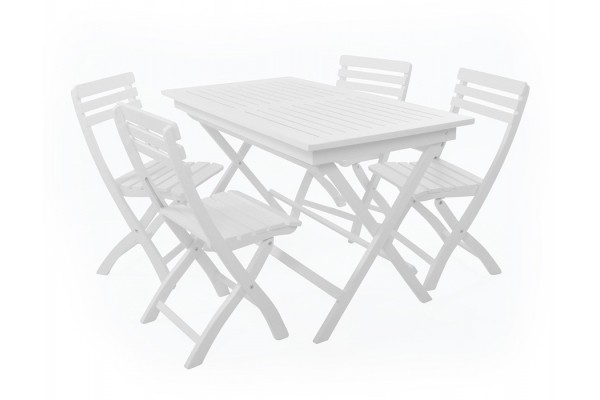 Flot sæt der består af 4 stk. foldestole uden armlæn samt foldebord på 70 x 130 cm. Passer perfekt til altanen – da bord og stole kan klappes sammen. I hvidmalet mahogni-træ.