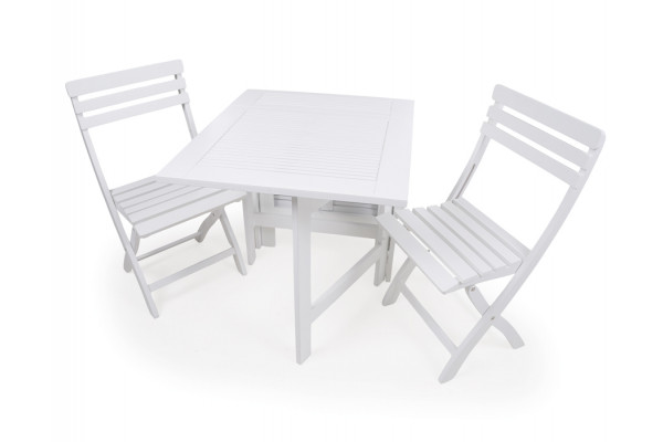 Sættet består af butterfly bord der kan foldes sammen så det næsten intet fylder. Hertil 2 foldestole uden armlæn. Foldestolene kan også foldes helt sammen.