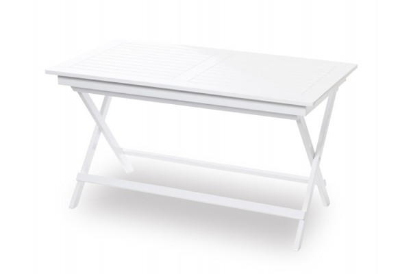 Foldebord i hvidmalet mahogni-træ.  Passer godt til haven eller altanen. Kan foldes sammen så det næsten intet fylder. Foldes let ved at skrue på 2 skruer. Hornbæk foldestole passer perfekt til.