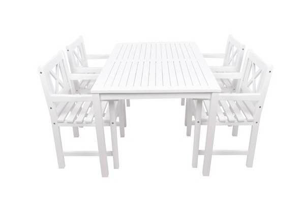 Flot hvidt havemøbelsæt i skandinavisk stil. Sættet består af bord og 4 stole. I hvidmalet mahogni-træ.