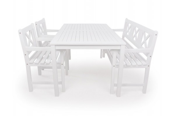 Flot hvidt havemøbelsæt i skandinavisk stil. Sættet består af bord, 2 stole og en bænk. I hvidmalet mahogni-træ