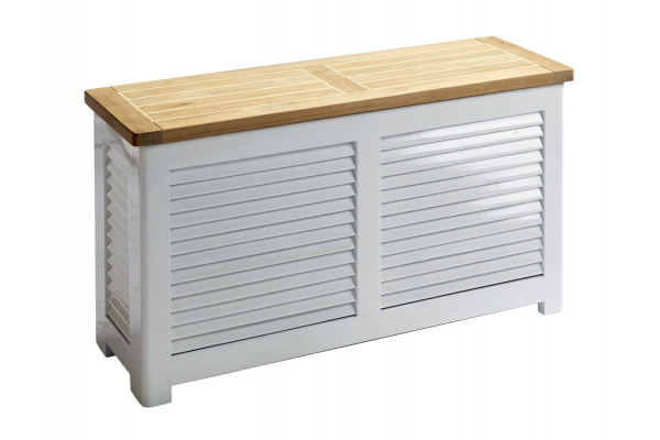 Opbevaringsbænk i hvidmalet mahogni. Bænken har teak låg med hvide gummifuger. Velegnet til opbevaring af f.eks. hynder eller indendørs til vasketøj. Kan også bruges som en ekstra siddeplads. Kan bruges inde eller ude.
