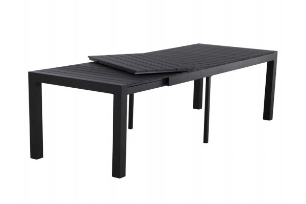 Johanne udtræksbord. I aluminium med bordplade i sort nonwood. Bordet er med 2 løse bordplader, der kan skjules under bordpladen.