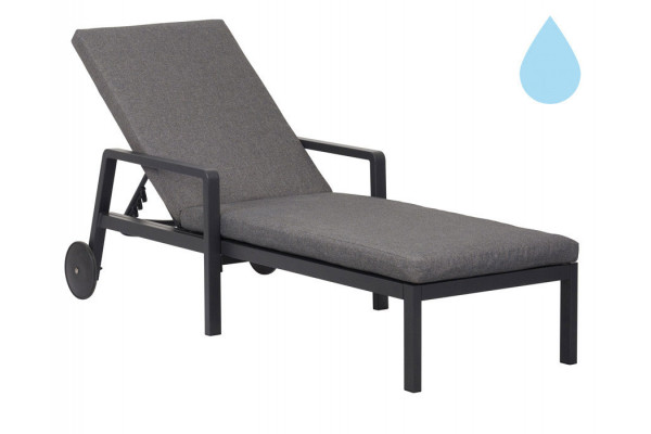 Enkelt solvogn med stel i sort aluminium og textiline. Med lækre grå hynder med vandafvisende betræk.