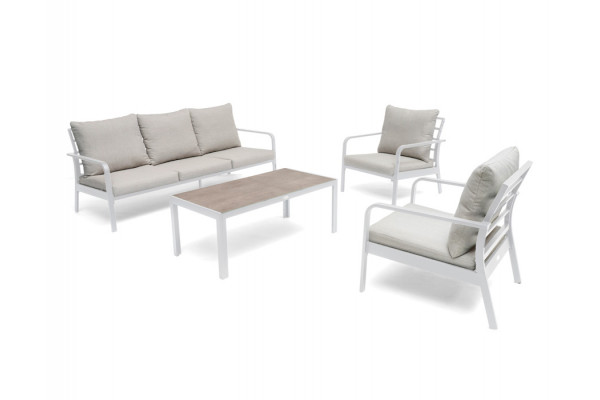 Lækkert sofasæt der med sit lette design giver et stilrent og moderne udtryk. Sættet har en robust ramme i aluminium og indeholder to lænestole, sofa, bord og hynder.