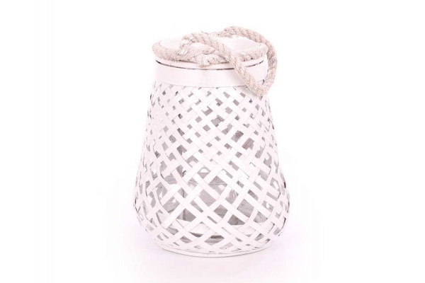 Flot lanterne i flettet hvidmalet bambus. Med reb-hank og glas-indsats.