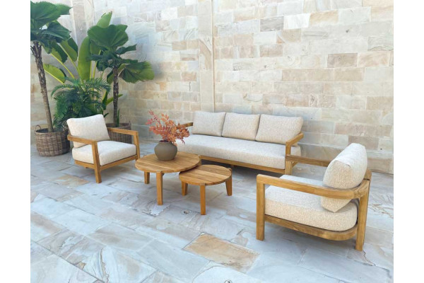 Sættet har stel i kerneteak i allerbedste kvalitet og hynderne er betrukket med Sunproof® stof, der er 100% Olefine, OEKO-TEX certificeret og 100% genbrugsmateriale. Den kan modstå både sol og regn. Hynde