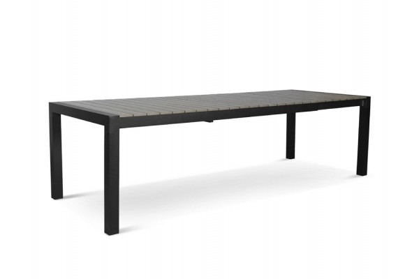Udtræksbord med smart udtrækssystem. I aluminium med kraftig bordplade i grå nonwood.