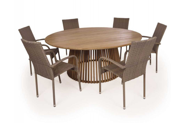 Fantastisk flot sæt med Luna bord fremstillet i kerne teaktræ fra Plantage i Indonesien.  Sammen med 6 Geneve stabelstole i luxus Dusty polyrattanflet.