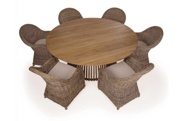 Sammen med 6 håndlavede Kato-stole i kraftig naturfarvet rattan incl. hynde med naturfarvet stof. (Stolene er ikke egnede til udendørs brug. Passer perfekt til den overdækkede terrasse eller ud