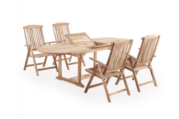 Sættet består af 4 stk. pos. stole med indstillelig ryg og stort ovalt udtræksbord med plade der foldes under bordpladen.