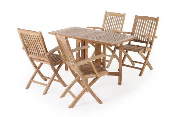 Dette sæt består af Marstal butterfly-bord samt 4 stk. Mia foldestole med armlæn. Fremstillet i kerne-teaktræ.