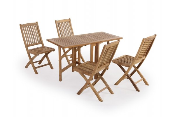 Dette sæt består af Marstal butterfly-bord samt 4 stk. Mia foldestole uden armlæn. Fremstillet i kerne-teaktræ.