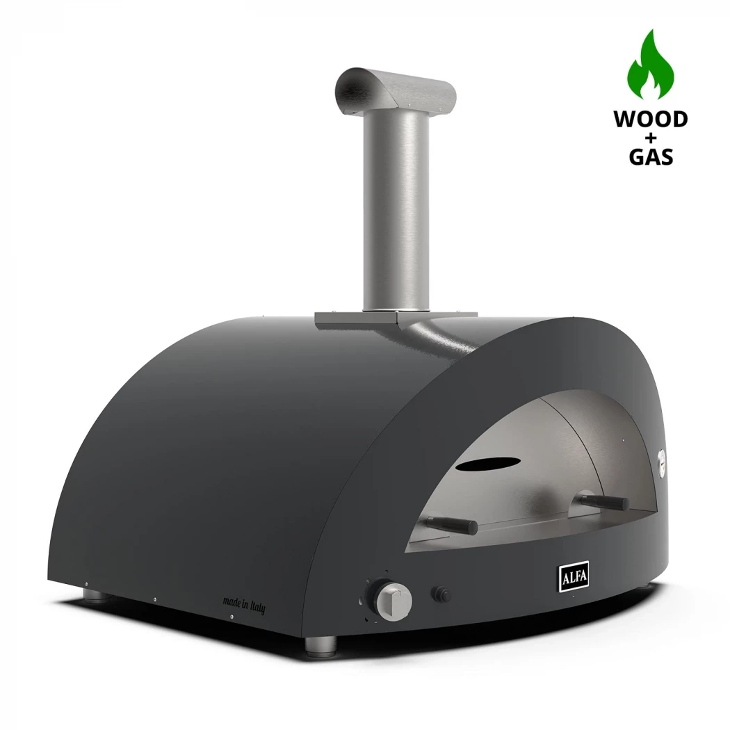 Moderno 5 Pizzaer Grå Hybrid: Grå hybrid ovn med kapacitet til fem pizzaer, understøtter både brænde og gas som brændstoffer. Ideel til store sammenkomster, hvor fleksibilitet og variation i madlavningen er vigtig. Ovnen sikrer en jævn varmefordeling og a