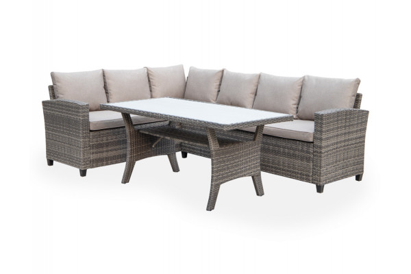 Montreal diningsæt kombinerer stil og funktionalitet med en stor hjørnesofa i grå 2-line polyrattan flet og et bord med en elegant cementbordplade. Sættet er bygget op af en stålramme, bløde vandafvisende hynder i 230 g polyester som giver en god komfort.