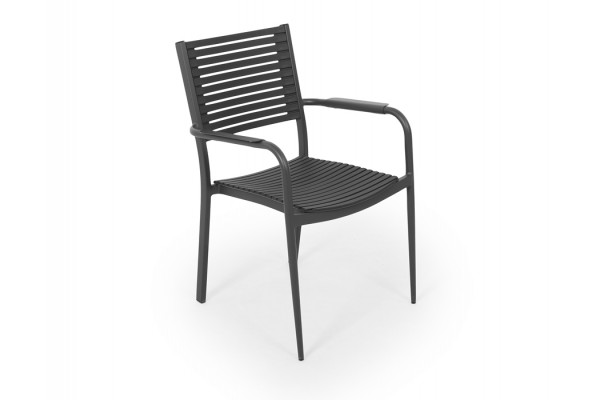 Elegant stabelstol med stel og armlæn i pulverlakeret antracitgrå aluminium. Sæde og ryglæn er i det slidstærke plastmateriale polyresin.