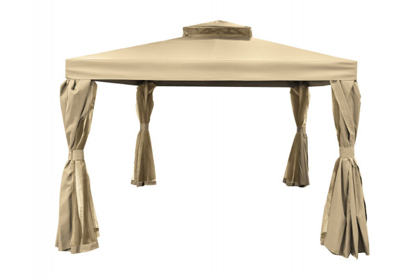 Flot pavillon med sider og tag i natur polyester og med sort stel. Pavillonen bliver leveret komplet med tag, myggenet og sidevægge. Væggene og myggenettet monterer man på en skinne så det nemt kan trækkes til side.