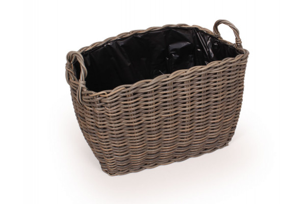 Oval plantekurv i dusty polyrattan-flet. Kurven er foret indvendig med sort plast og har 2 hanke.