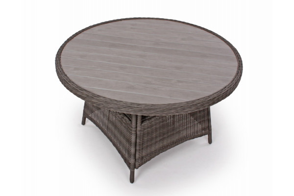Kraftigt bord i aluminium med grå polyrattan flet. Bordplade med flotte grå nonwood lameller.