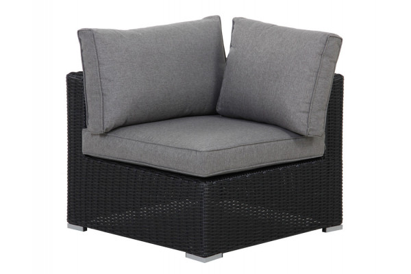 Med løse hjørnemoduler kan du skræddersy dit loungesæt præcis efter dine behov og ønsker. Modulet er bygget på en stærk aluminiumsramme og beklædt med kraftigt, sort rundflettet polyrattan, hvilket giver et stilfuldt og holdbart udtryk.