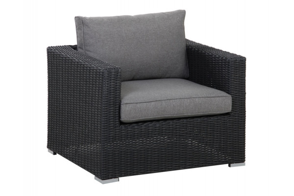 Luksus sofastol i alu med kraftig rund polyrattan flet i sort. Inkl. kraftige grå hynder.