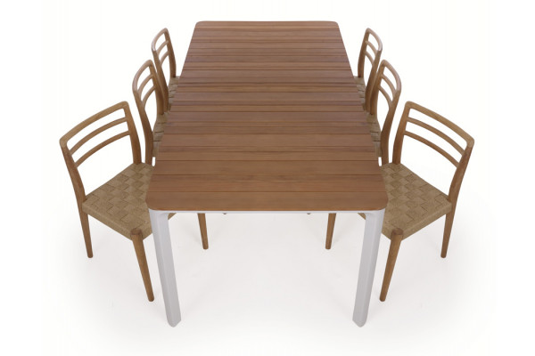 Havemøbelsæt med Ronja havebord og 6 Duri teak havestole.
