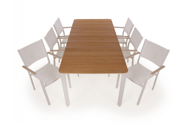 Havemøbelsæt med Ronja havebord og 6 Mette stabelstole.