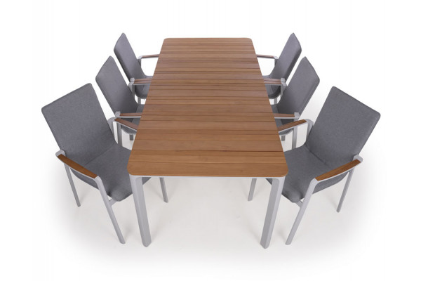 Bordet og stolene har stel i hvidmalet aluminium. Bordet har bordplade i superflot kerneteak og er med justerbare fødder, for at sikre stabilitet på ujævne overflader.