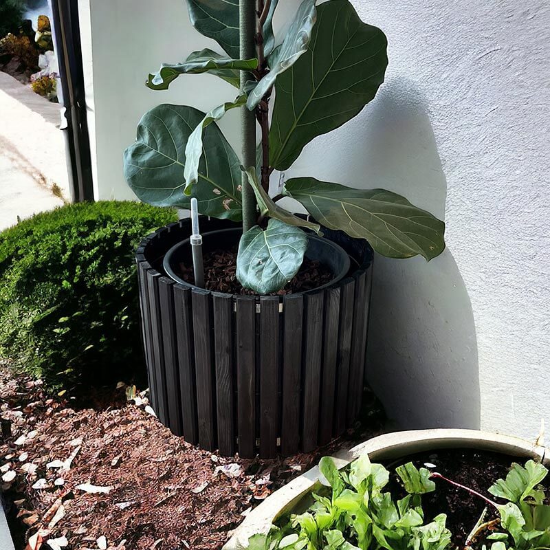 Rundt højbed i sort træ ø60 cm Her får du et helt unikt rundt højbed i sort træ, som kan bruges til mange forskellige formål. Den er foret med kraftig ukrudtsdug, hvilket betyder at du kan fylde den jord, men den egner sig også som fx en potteskjuler. Den