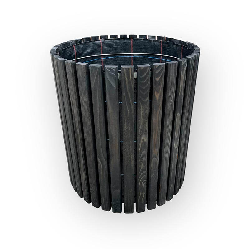 Rundt højbed i sort træ ø60 cm Her får du et helt unikt rundt højbed i sort træ, som kan bruges til mange forskellige formål. Den er foret med kraftig ukrudtsdug, hvilket betyder at du kan fylde den jord, men den egner sig også som fx en potteskjuler. Den