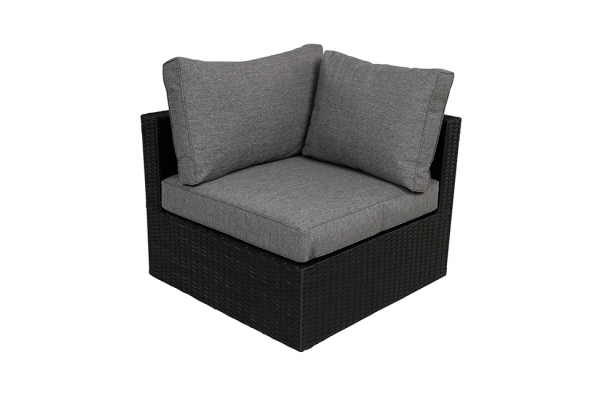 Sala hjørnemodul i vedligeholdelsesfrie materialer, der har en robust aluminiumsramme samt flettet sort polyrattan. De grå Vandafvisende hynder, der medfølger, er med en TPU-belægning på bagsiden, hvilket gør dem vandafvisende.