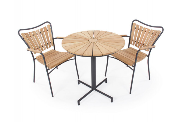 Sættet et med 2 stk. stabelstole og 70 cm. rundt bord. Antracitgråt aluminiumsstel med teaktræs lameller i super kvalitet.