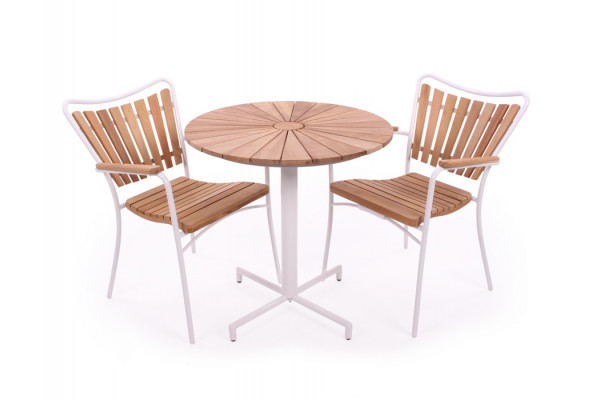 2 stk. stabelstole og rundt bord. Hvidt aluminiumsstel med teaktræ i super kvalitet.