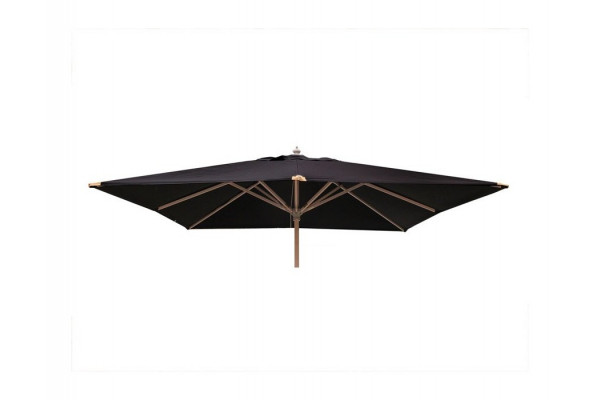 Markedsparasol i 2,5 x 2,5 meter med tilt. 48mm stok i hård træ. Med forstærkninger (imiteret læder) og beslag på ribender