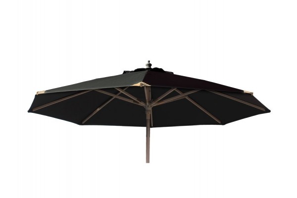 Rund luksusparasol med tilt og kraftige ribber. 2-delt stok i hårdttræ (38 mm). Dug i sort polyester.