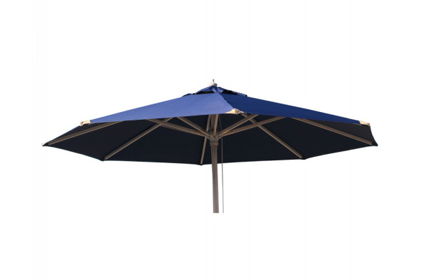 Rund luksusparasol med kraftige ribber. 2-delt stok i hårdttræ (48 mm). Dug lavet i blå polyester.