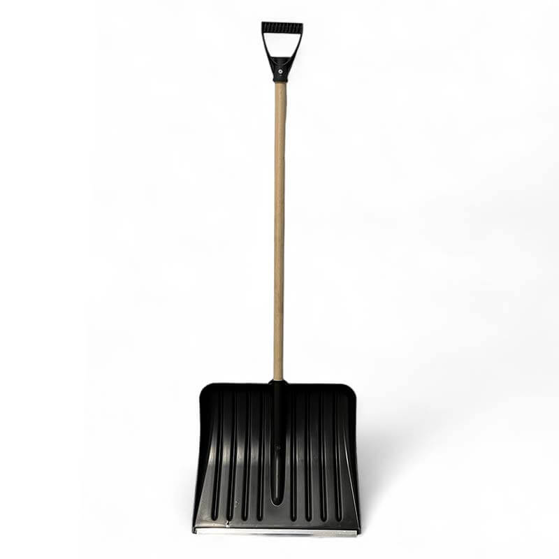 Kraftig sneskovl Her får du en effektiv og prisvenlig sneskovl, udført i kraftig træ og plast. Vinklen på skovlen er ergonomisk udformet, så du skåner ryg og skuldre mest muligt ved brug. Bladbredde: 50 cm. Bladlængde: 45 cm. Bladdybde: 7 cm. Samlet længd