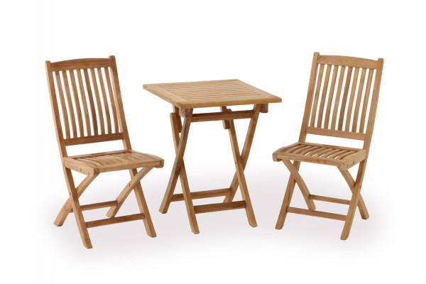Teak Cafesæt i super kvalitets kerne teak. Et perfekt sæt til altanen da både bord og stole kan slåes sammen.