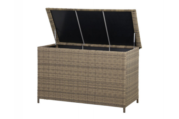 Hyndebox med alu-stel og kraftig Dusty polyrattan-flet med plader i låg og sider.