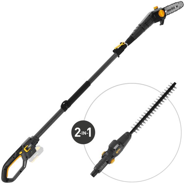 I PHX/PCX2000 2-i-1 får du både en praktisk batteridrevet stanghækkeklipper og stangkædesav, da du nemt kan montere begge arbejdshoveder på teleskopskaftet uden brug af værktøj. Som stangkædesav kan du justere teleskopskaftet, så du får en totallængde på