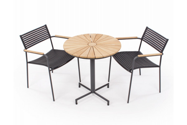 Cafésæt der består af 2 stk. Tika Air stabelstole og rundt Rørvig cafébord.
