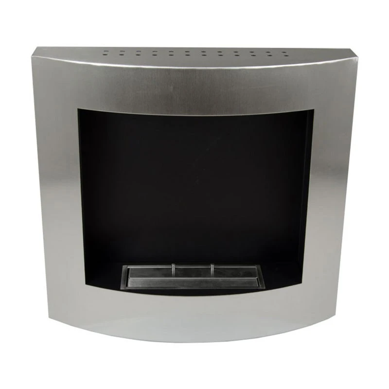 ScandiFlames væghængt biopejs i rustfrit stål med buet front. Måler H: 55 cm, B: 60 cm, og D: 17 cm. Den har en brændetid på op til 2,5 timer pr. 1 liter bioethanol, hvilket giver en varmeeffekt på 2,5 kW. Pejsen har et råt udtryk med sin ubehandlede stål