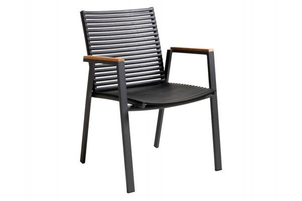 Enkel og stilren stabelstol med armlæn i teaktræ og stel i antracitgrå aluminium.