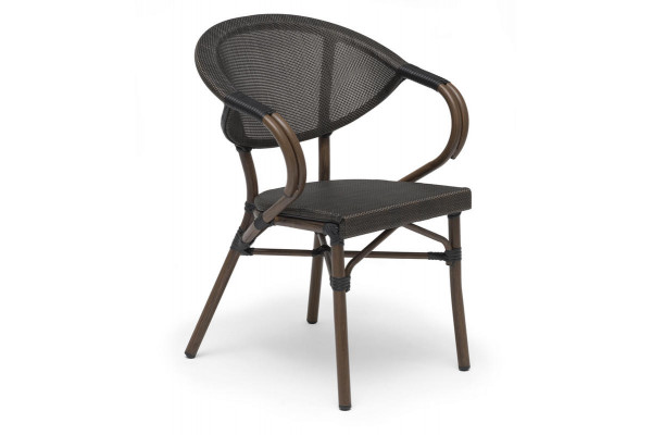 Dekorativ stabelstol med textilene på sæde og ryg. Stellet er fremstillet i brun aluminium.